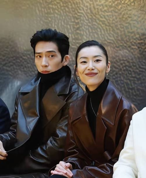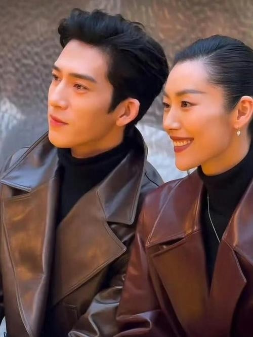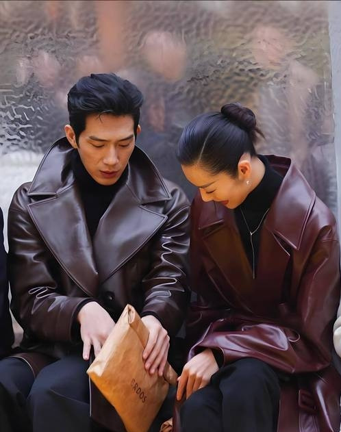 刘雯与井柏然身着同款皮衣选择不同色系。刘雯的酒红色长款皮衣搭配腰带,勾勒超模身形,内搭黑色高领毛衫。井柏然的深棕色短款皮衣采用无腰带设计,内搭与刘雯同款。这种风格呼应的穿搭展现情侣间的高端时尚品味。